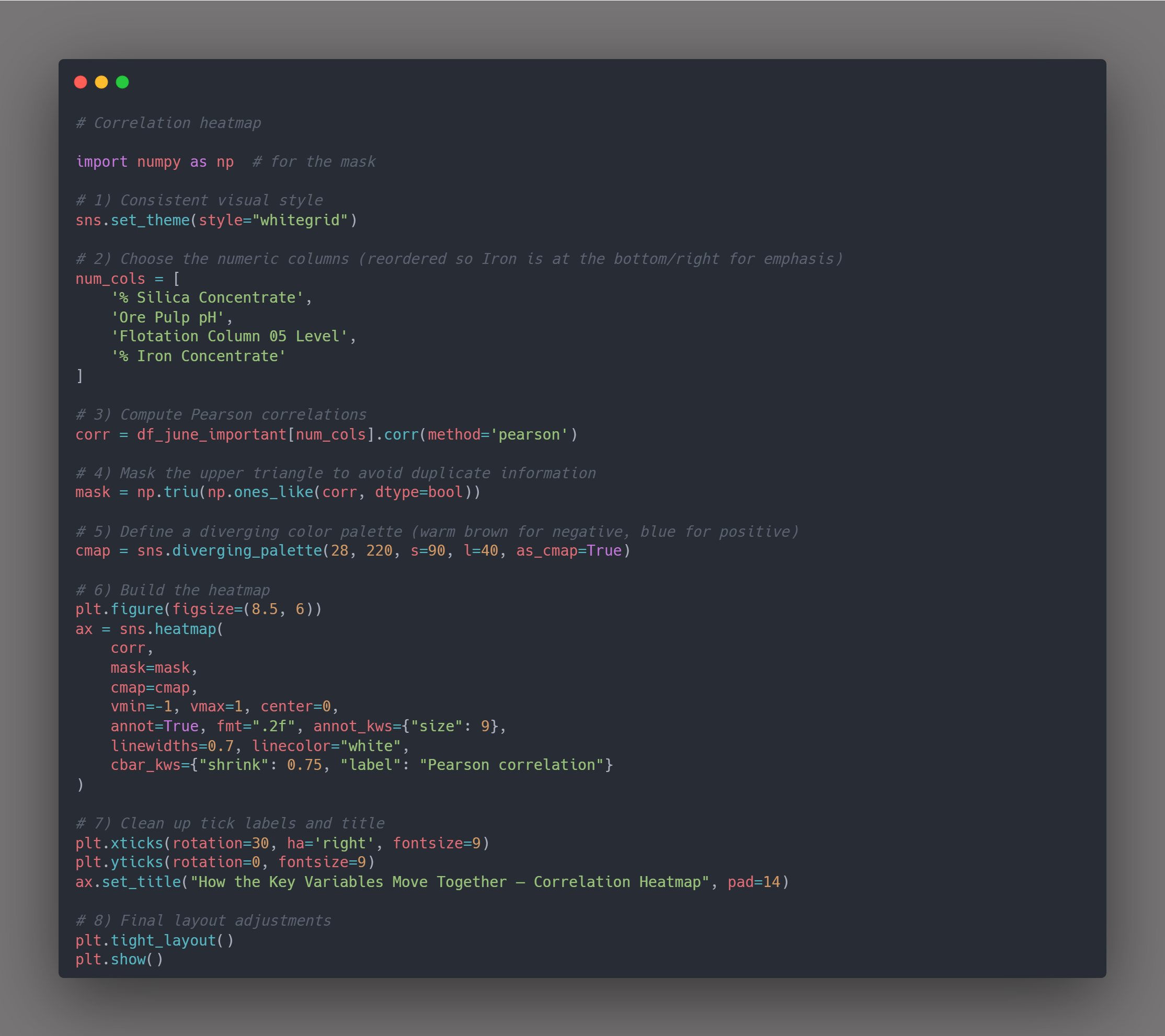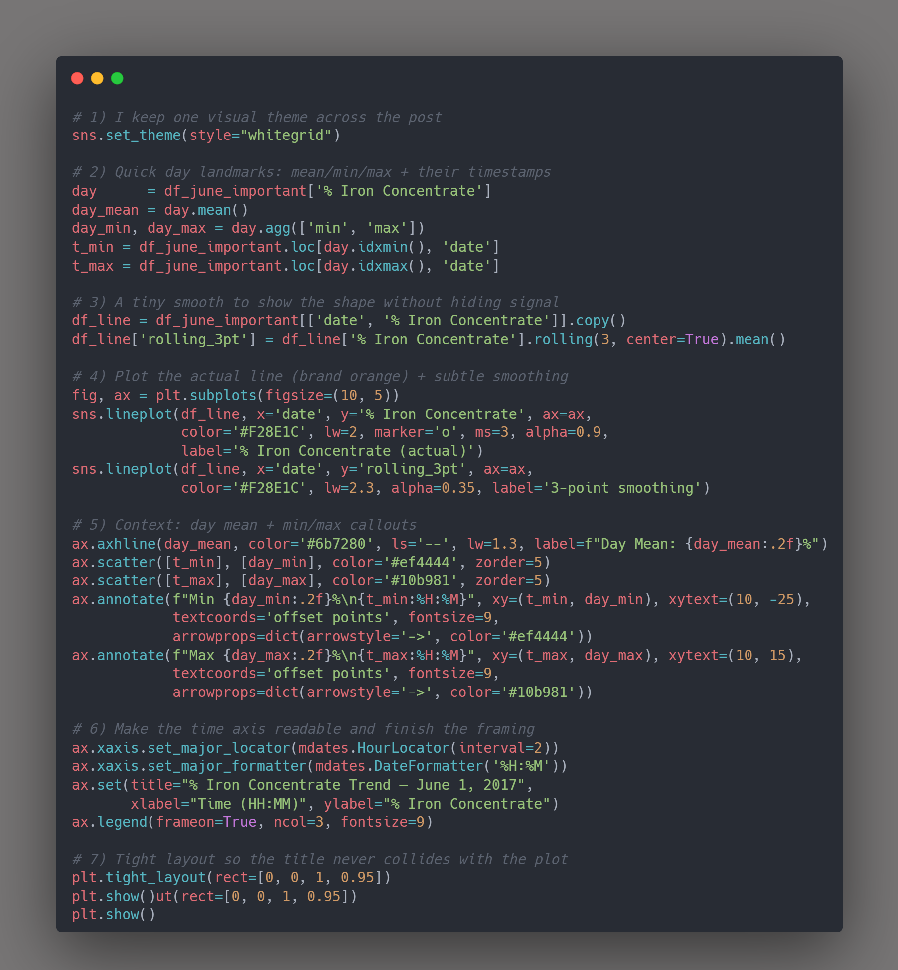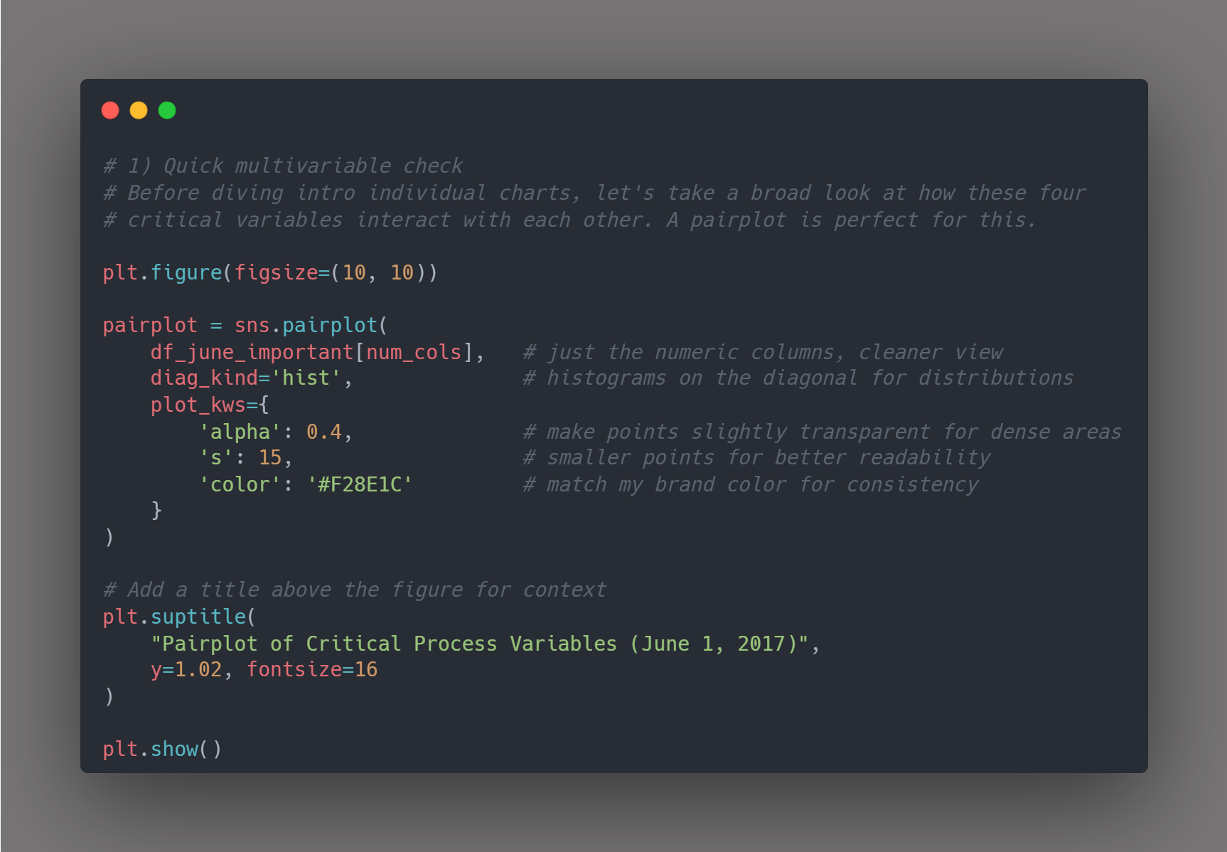 Most dashboards just show you a line chart and call it a day. This post is different.You’ll see how to:- Filter raw process data to a single day and keep only the important variables.- Turn 4,320 rows into a clear hourly snapshot that anyone can scan.- Plot a smooth but honest trend with min/max callouts and a day mean reference.- Check relationships visually with a pairplot and a correlation heatmap.And you’ll get copy-paste-ready Python code for every step — so you can replicate this workflow on your own data tomorrow.