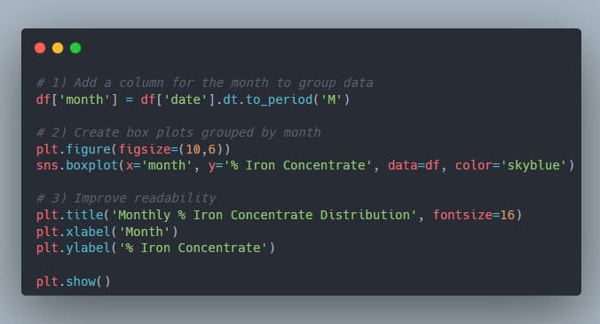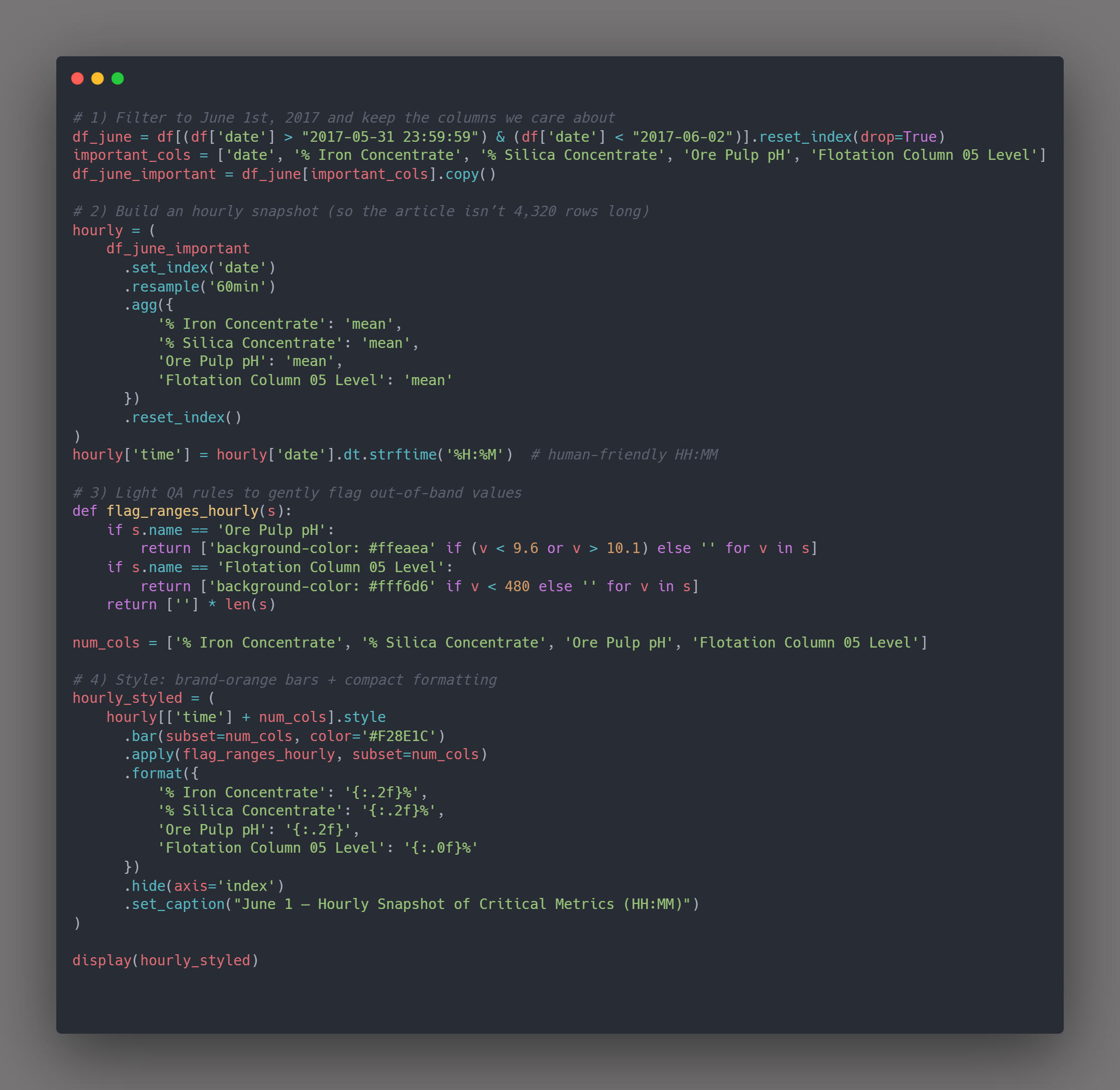 This wasn’t random — the dataset comes from a flotation plant in mining, and the lesson had us:1.Check the full date range so we know what we’re working with.2. Filter down to one specific day (June 1, 2017, flagged as “something weird happened”).3. Focus only on key process variables:I loved this assignment because it forced me to scope aggressively, keep the analysis tight, and practice telling the story of a single day in data — exactly what process engineers or ops leaders need when they’re reviewing production issues.