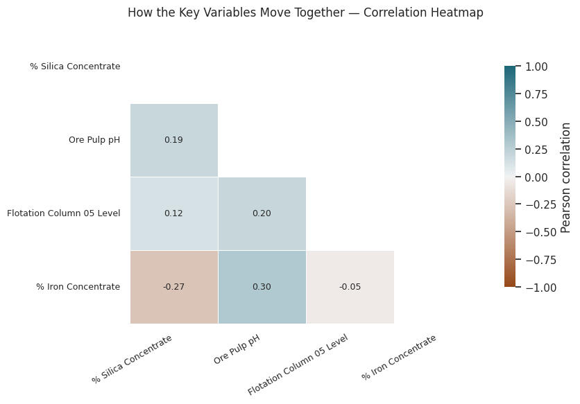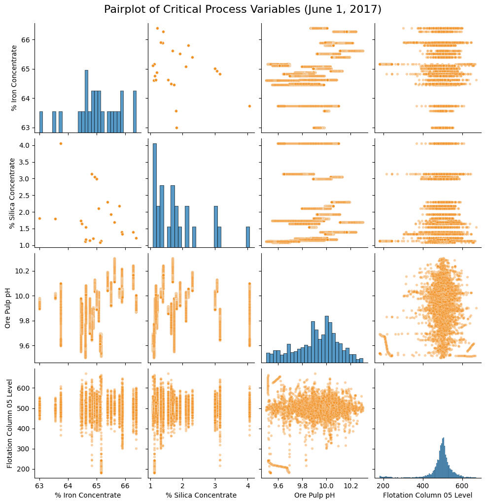 From the original 24 columns, we focus on just the most relevant process variables — the ones our engineer peers told us have the biggest impact on product quality:- date – Timestamp of the reading, needed for filtering, resampling, and trend analysis- % Iron Concentrate – Final output quality metric, our primary target variable (higher = better)- % Silica Concentrate – Impurity metric, lower is better and directly affects product quality- Ore Pulp pH – Process condition, pH levels can make or break flotation efficiency- Flotation Column 05 Level – Key equipment parameter indicating process stability✅ Key Takeaway: Narrowing down to these columns makes the analysis more focused, interpretable, and avoids unnecessary noise.